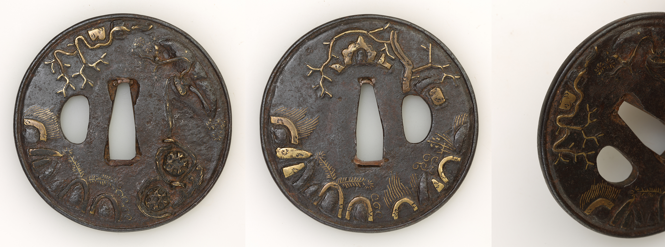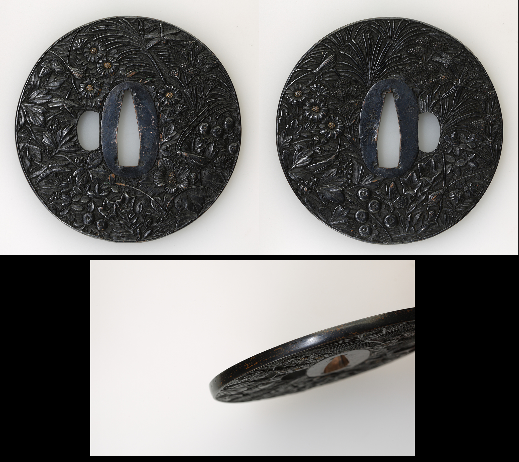 素材 赤銅 技法 魚々子地 高彫 金色絵 特徴 秋草の画題で組み合わせた刀装具のセットです。お拵の製作にいかがでしょうか。 状態 わずかに魚々子地の擦れや金色絵の摩耗がありますが、そのほかは概ね良好です。 拡大画像1 |