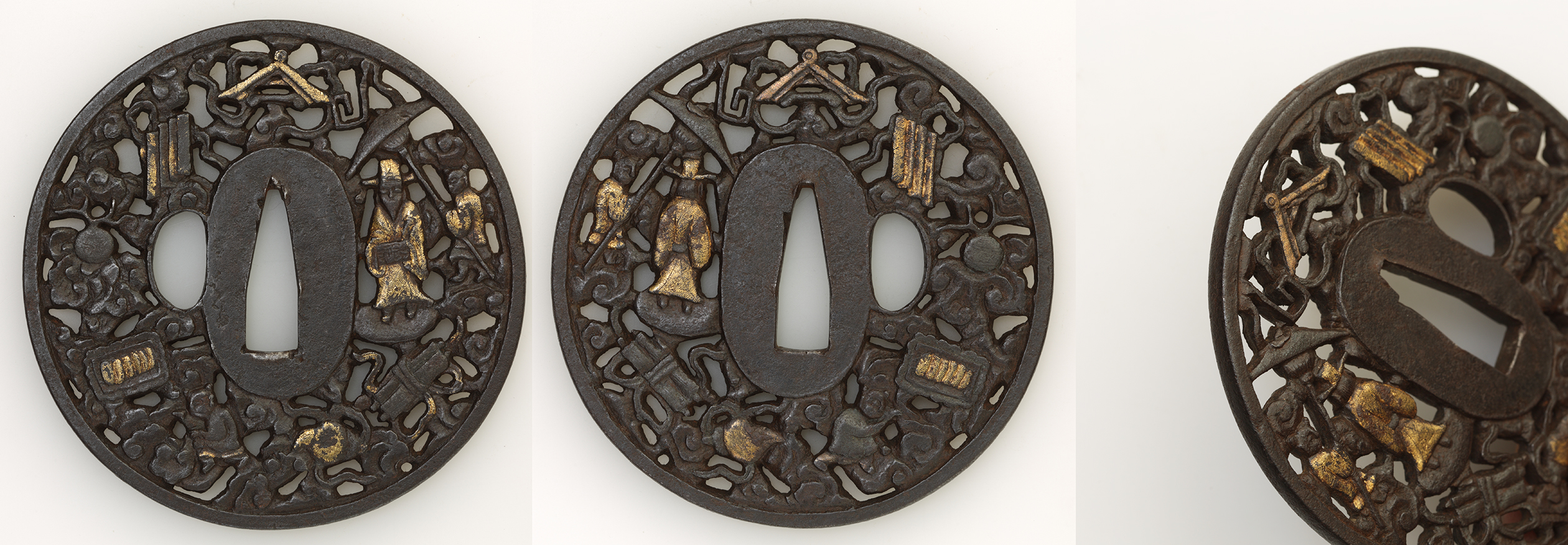 品番 【B050321】 題 左右扇面透 銘・作者 無銘(肥後) 寸法 縦 8.09cm、横7.61cm、耳厚さ 0.40cm、 重さ 100.4g 時代 江戸時代 価格 200,000円(消費税込み・送料込) 鑑定書 特別保存刀装具鑑定書(日本美術刀剣保存協会R2.8.25発行) |