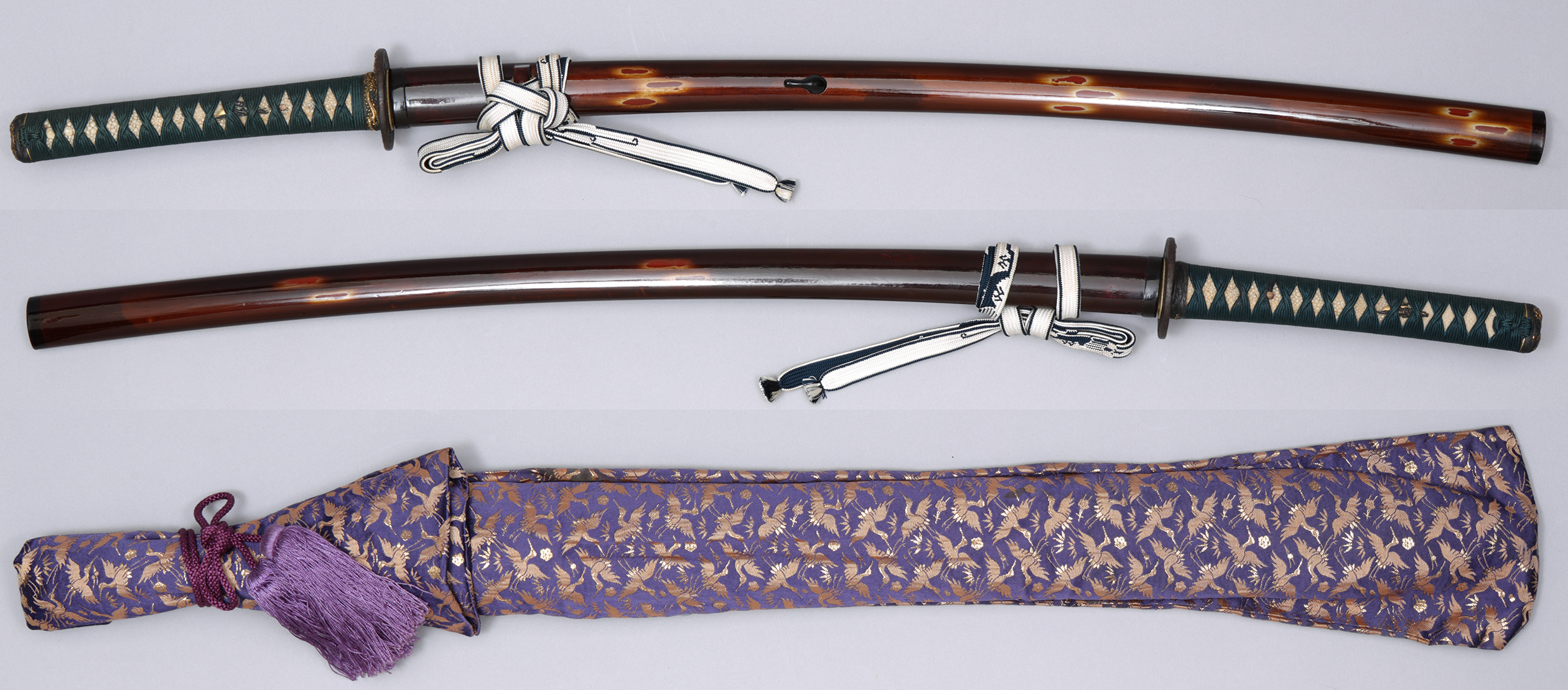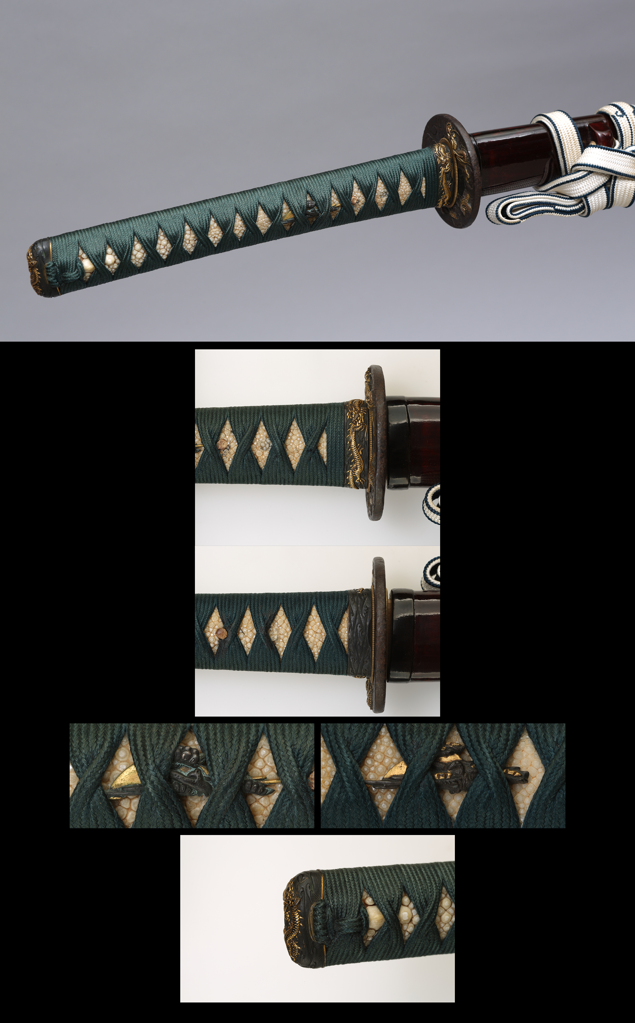縁頭・ 素文図(鉄磨地) 目貫 三鈷柄剣図(銅地容彫金色絵) 鐔 雲龍図(鉄地、銘 : 越前住記内) 柄 黒糸諸捻巻 鞘 皺革包に赤茶色の漆塗りを施しています。 状態 良好です。柄は近年巻直されています。塗鞘の補修跡があります。 拡大画像1、拡大画像2 |