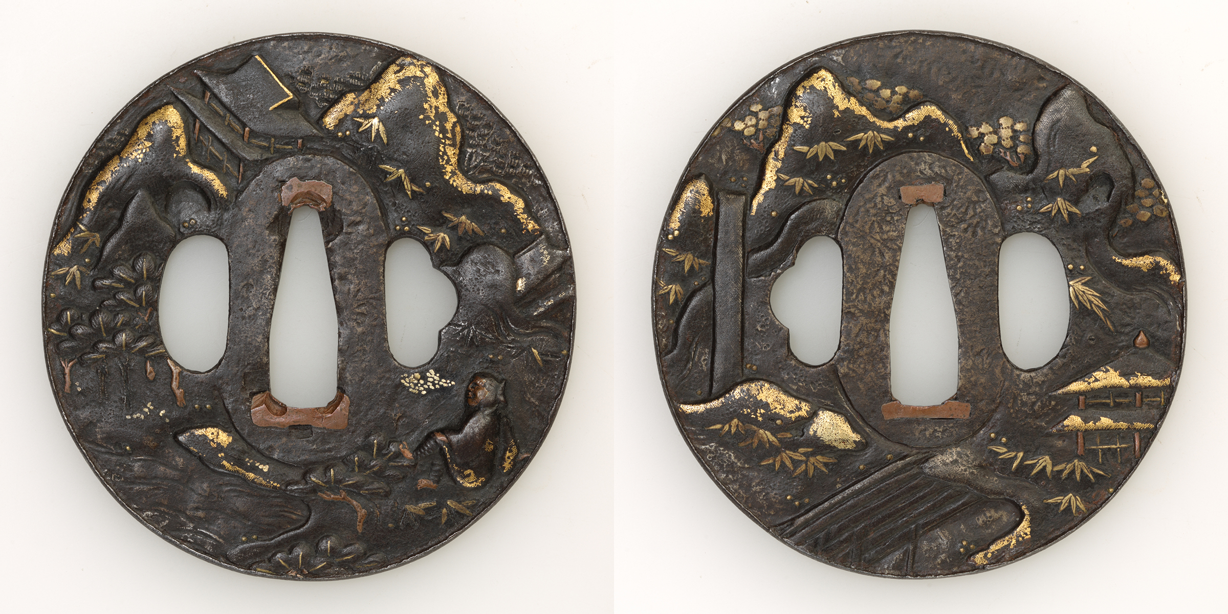 素材 鉄地 金 形 竪丸形 櫃孔 両櫃孔 技法 布目象嵌 特徴 風光明媚な山水の景色が、金布目象嵌の手法で描かれた鐔です。 状態 良好です。 (仕覆入り) 拡大画像はこちら |