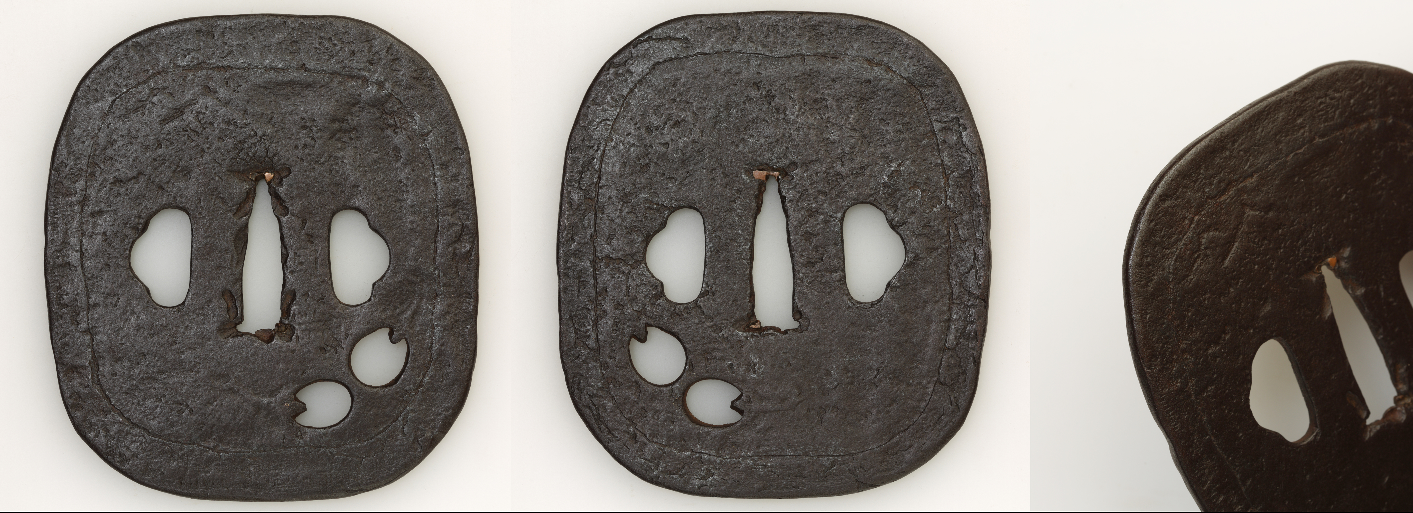 素材 銅 形 竪丸形 技法 磨地、角耳小肉 櫃孔 片櫃孔 特徴 重ねの厚い短刀の拵に用いたとみられる喰出鐔です。黒味を帯びた銅地に、微細なV字状の模様を刻み、耳際に鐔の輪郭と平行な線をランダムに細く途切れがちに浅く掻き、櫃孔と茎孔を挟んで反対側に鞘止孔があります。 状態 良好です。裏に緑青がわずかに出ています。 拡大画像はこちら |