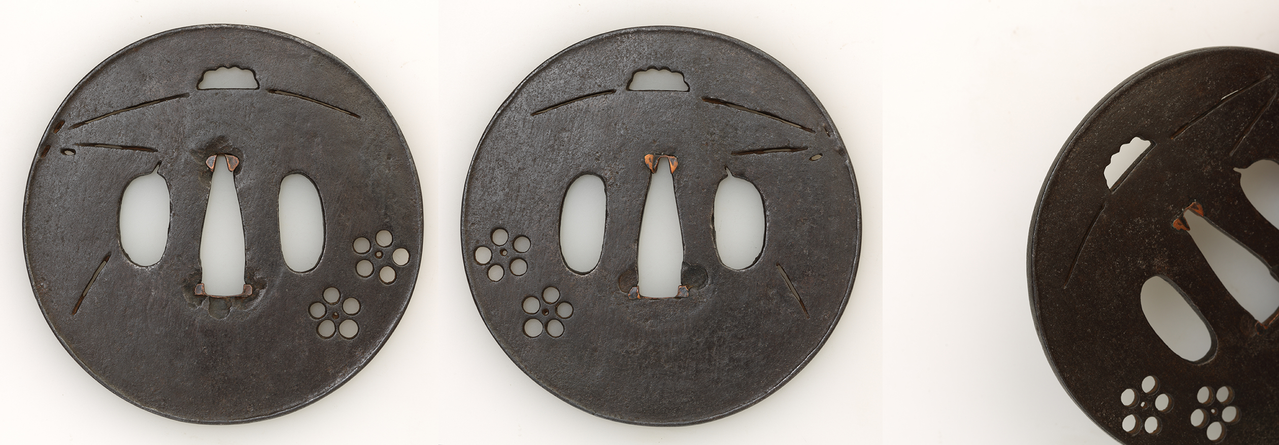 素材 鉄 形 木瓜形 櫃孔 両櫃孔(片櫃孔埋) 技法 鋤下彫 特徴 縦長の丸みを帯びた木瓜形の中に直線で菱を切り、その枠内にそわせるようにして端正な菊花の図を表しています。 状態 赤錆が浅く出ているところがあります。 拡大画像はこちら |