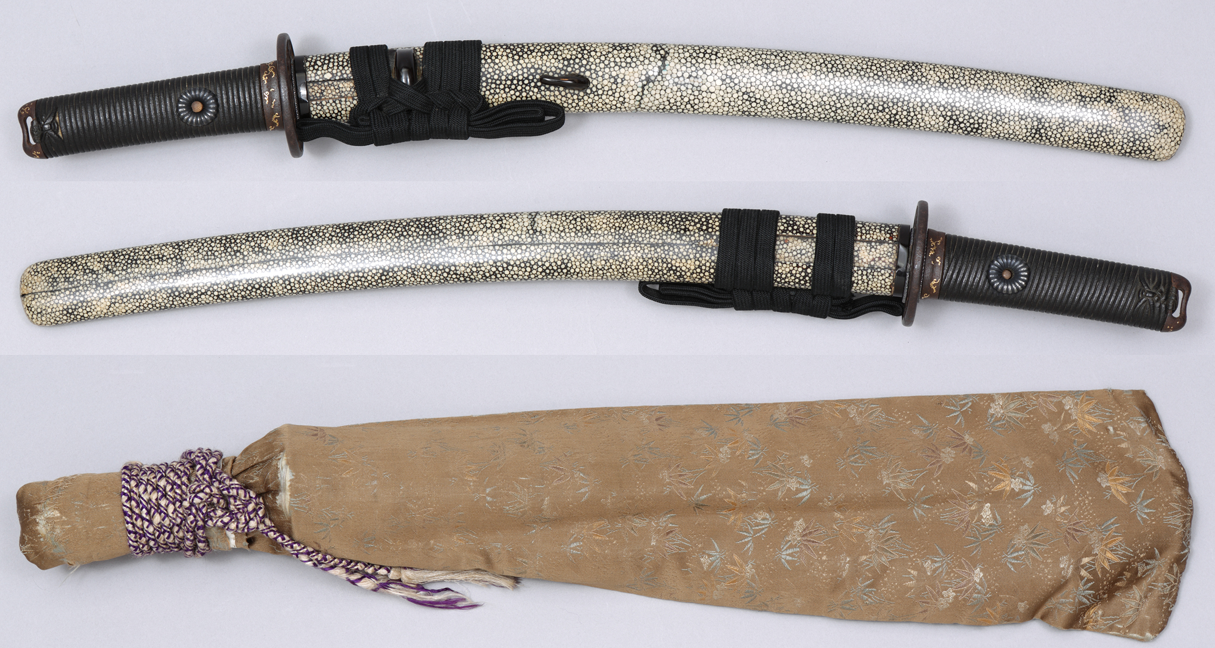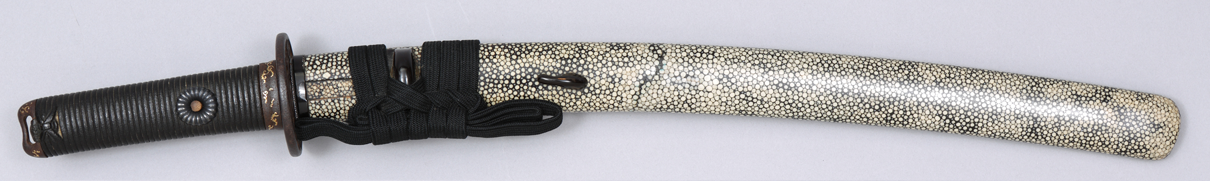 | 品番【B051225】 品名 鮫皮研出鞘脇差拵 寸法 拵全長 64cm 時代 江戸時代 価格 150,000円(消費税・送料込) 刀身は入っておらず、ツナギと呼ばれる、木材でできた刀身の形に削り上げられたものが入っています。 |