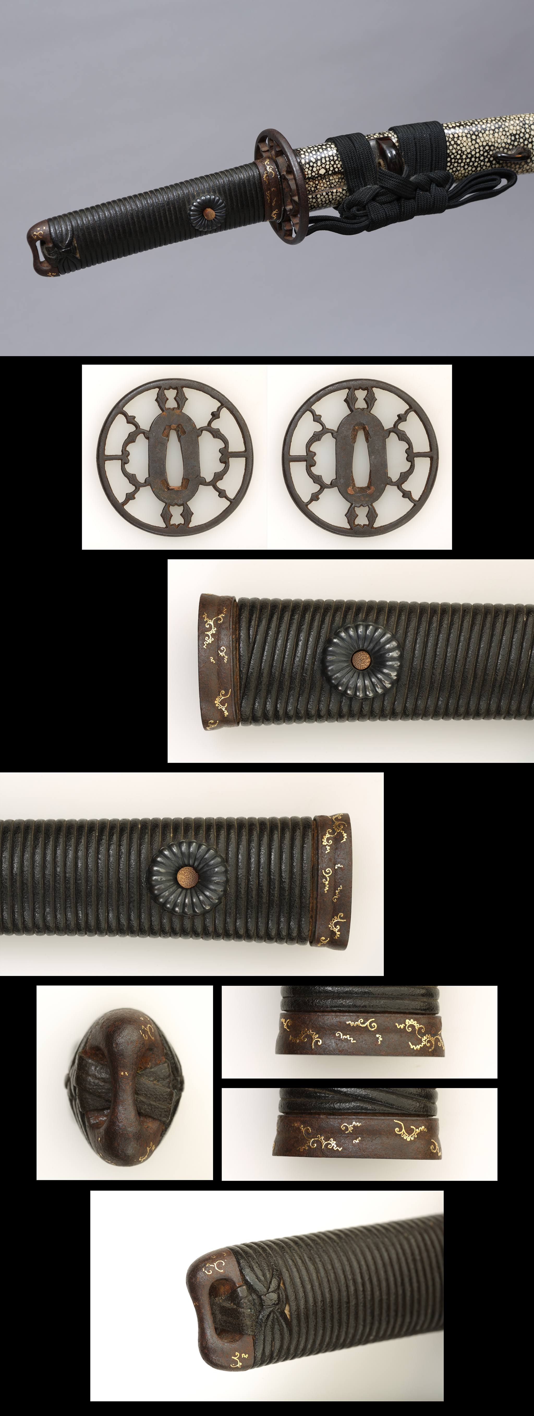 縁頭 : 銘 吉岡因幡介 龍図(赤銅磨地 高彫金色絵) 目貫 : 大袖図(容彫 金色絵) 特徴 : 親粒の入った白鮫着の状態の良い柄前です。迫力ある龍図の縁頭に、鎧の大袖の図の目貫の組み合わせ。黒色柄糸の諸摘巻は近年に新たに施されたとみえ状態良好です。 拡大画像はこちら |