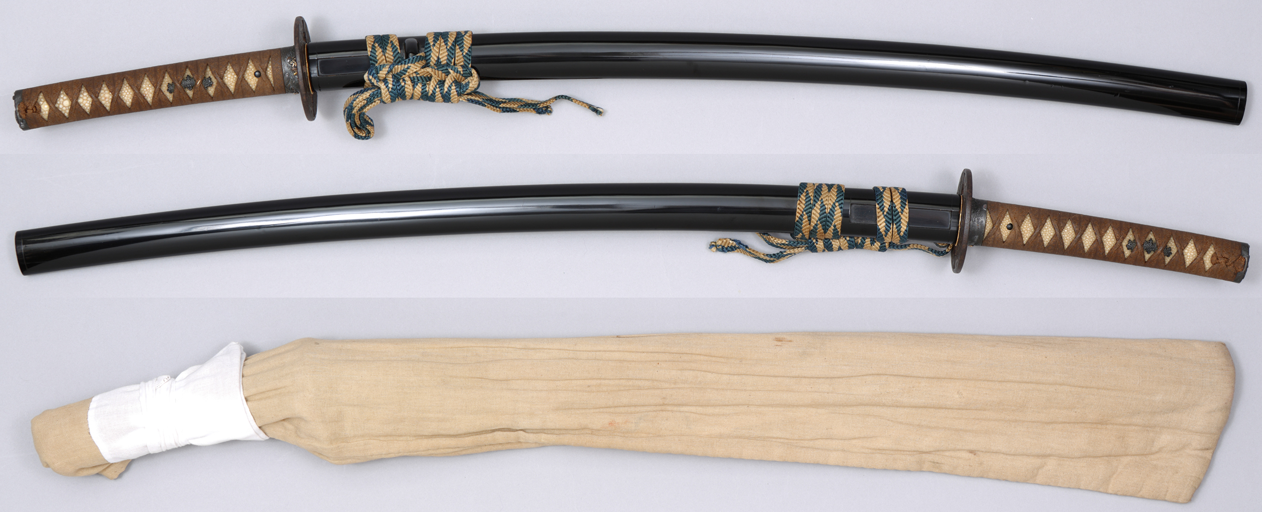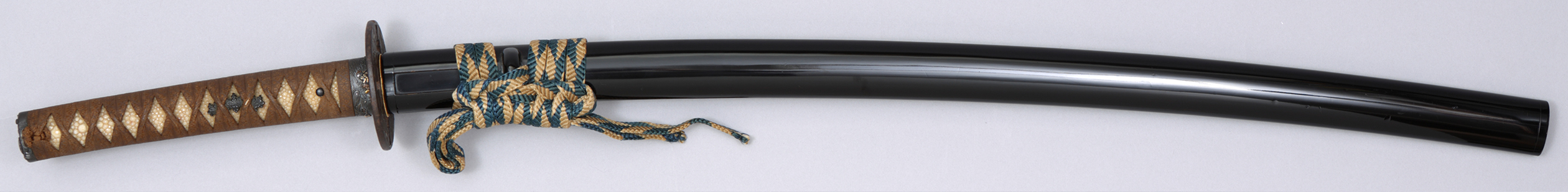 | 品番【B61225】 品名 黒呂色塗鞘打刀拵 寸法 拵全長 99cm 時代 江戸時代 価格 650,000円(消費税・送料込) 認定書 柄前 : 特別貴重小道具 (日本美術刀剣保存協会 昭和52年6月11日発行) 刀身は入っておらず、ツナギと呼ばれる、木材でできた刀身の形に削り上げられたものが入っています。 |