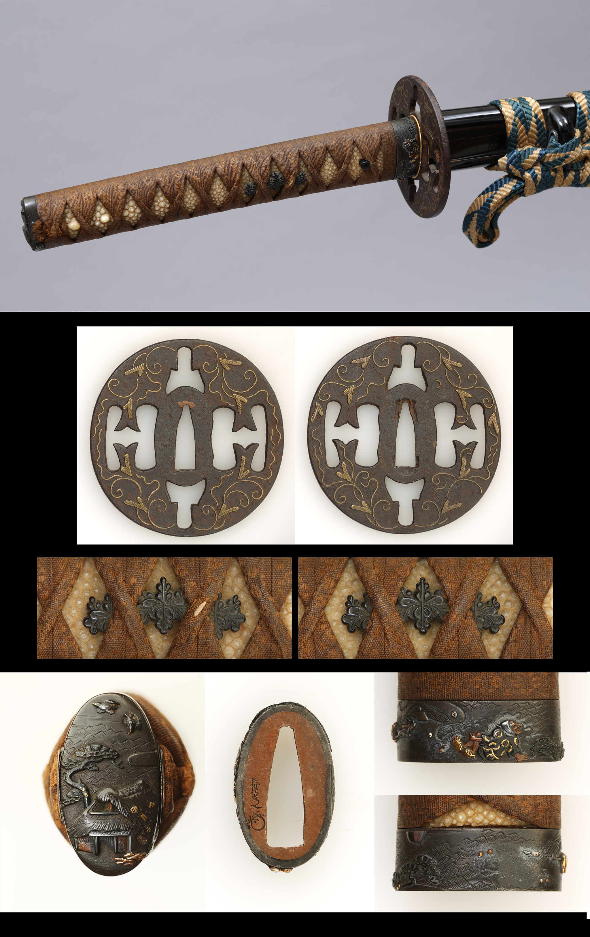 縁頭 桜図(鉄地 布目象嵌) 目貫 鯛図(容彫 金色絵) 鐔 喰出木瓜形 梅樹図 柄 金茶色糸諸捻巻 鞘 茶系変塗 はばき 素銅地銀鍍金 状態 使用感はありますが、おおむね良好です。小柄はありません。 拡大画像 拵全体、拡大画像 部分 |