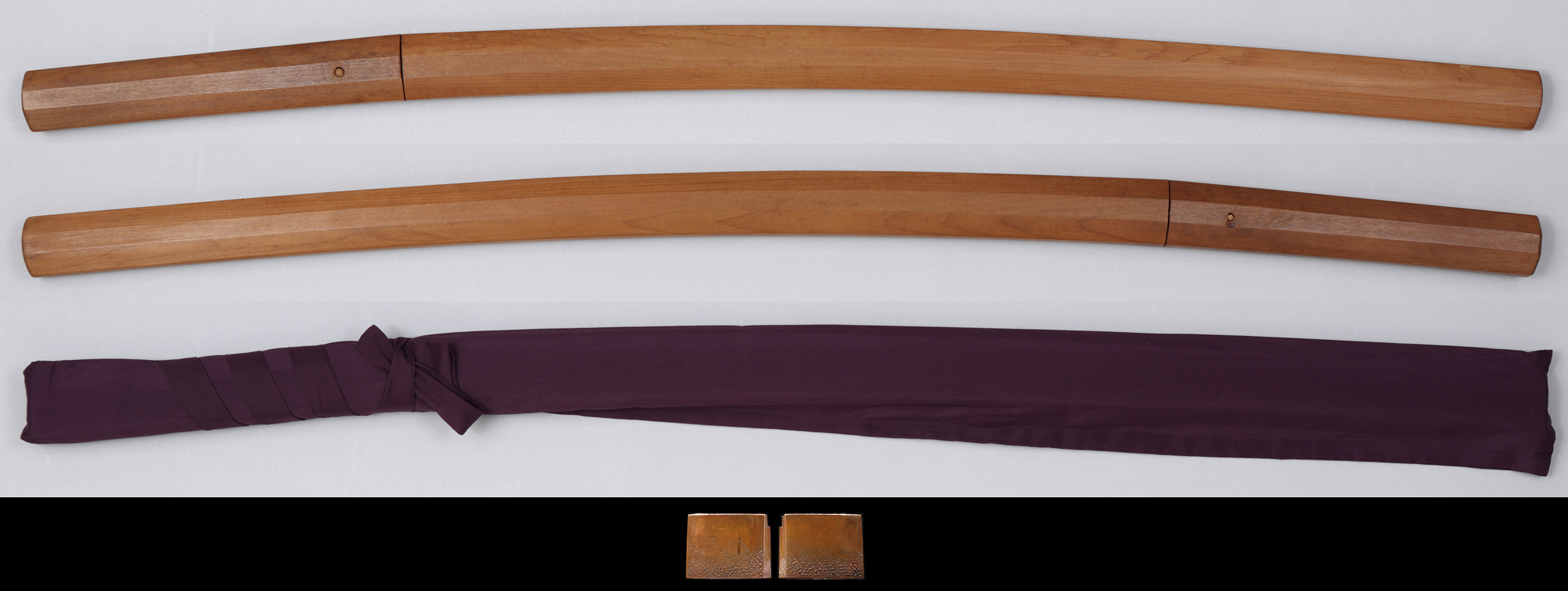 【寸法】刃長 70.0cm(2尺3寸1分0厘)、反り 1.2cm(3分9厘)、元幅 3.31cm、元重ね 0.75cm、先幅 2.29cm、先重ね 0.53cm、目釘孔 2個(内1個埋)、刀身重量 946g 、白鞘全長 99.5cm |