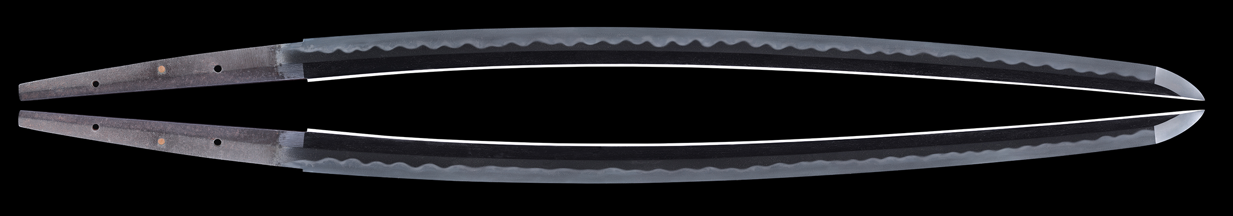 【寸法】刃長 72.4cm(2尺3寸8分9厘)、反り 1.9cm(6分2厘)、元幅 3.41cm、元棟重ね 0.77cm、元鎬重ね 0.85cm、先幅 2.62cm、先重ね 0.59cm、目釘孔 3個中1個埋、刀身重量 1,030g 、白鞘全長 101cm、拵全長 102.5cm