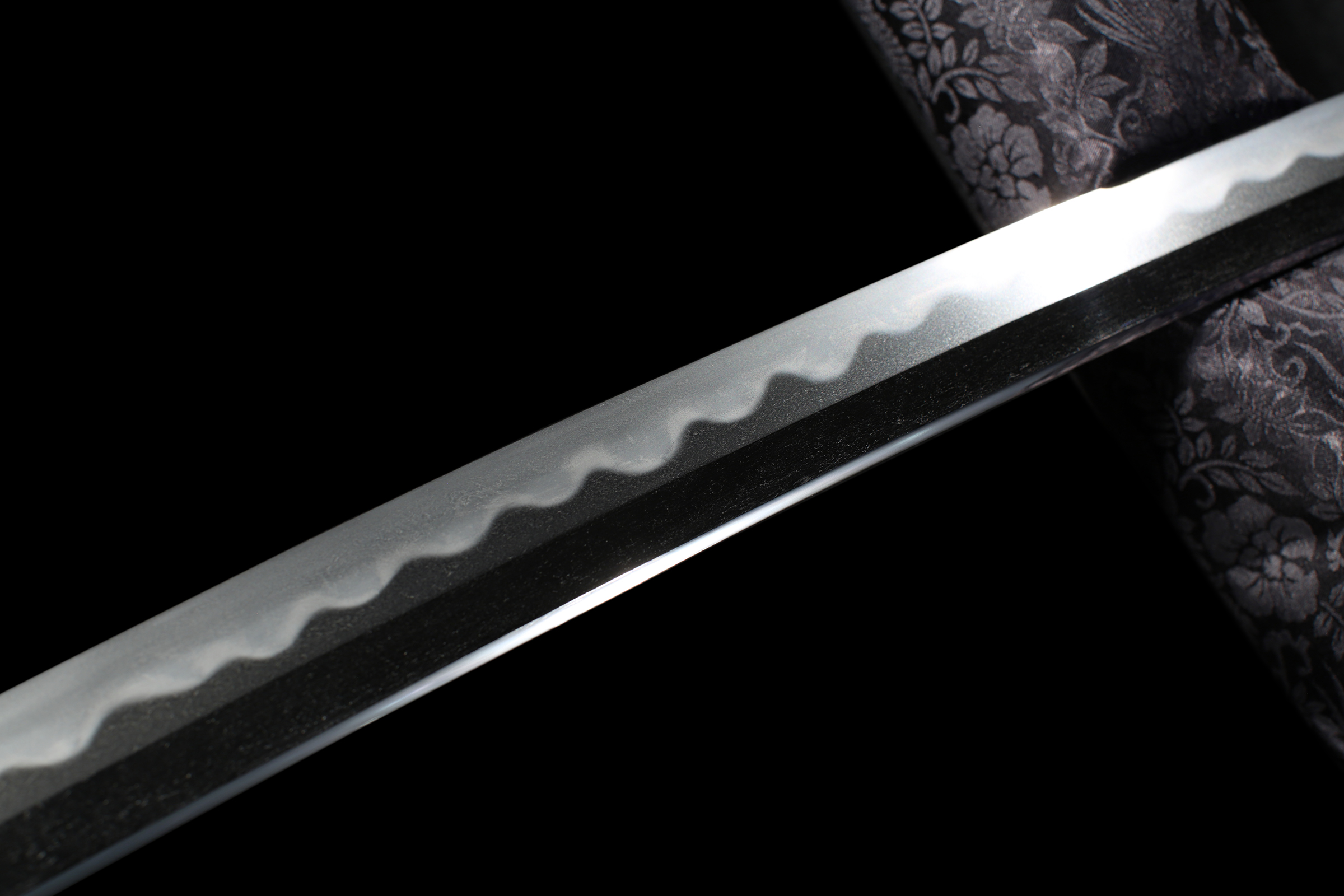 【特徴】鎬造、庵棟、身幅広く、重ね厚く、反りややつき、中切先延びる姿。 刃文は、腰開き互の目乱れ、足・葉入り、小沸つき、細かな砂流しかかり、飛焼き入る。 帽子は、わずかにほつれて小丸に返る。 |