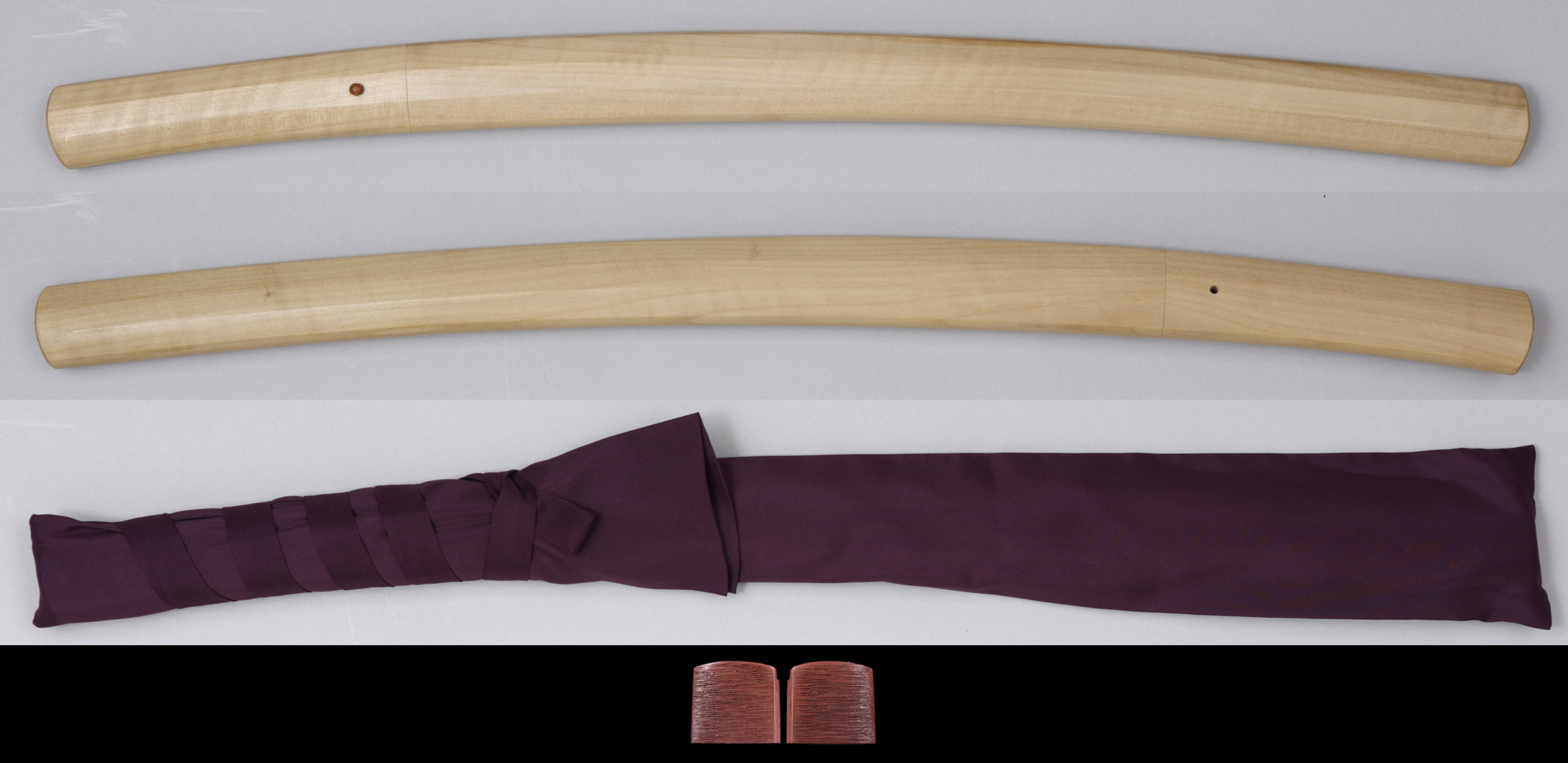 【寸法】刃長 47.3cm(1尺5寸6分1厘)、反り 1.2cm(3分9厘)、元幅 2.84cm、元重ね 0.65cm、先幅 2.14cm、先重ね 0.38cm、目釘孔 1個、刀身重量 383.5g 、白鞘全長 69.5cm、拵全長 67cm |