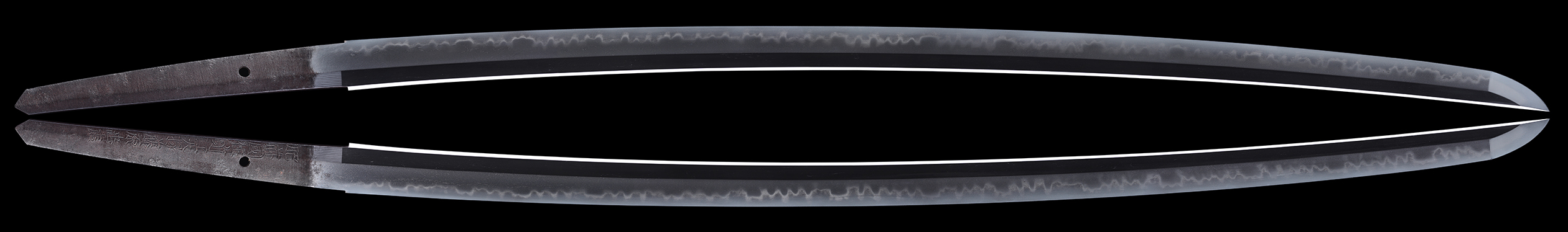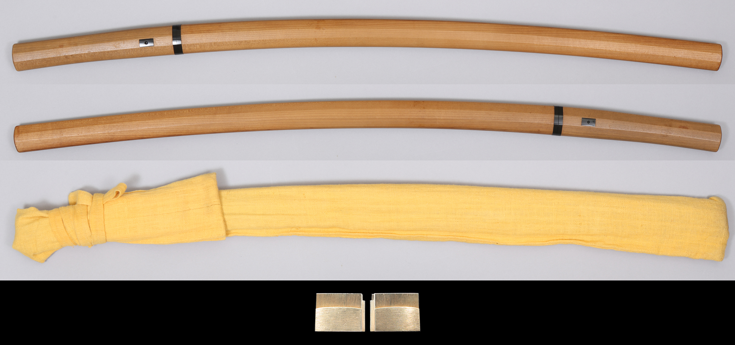 【寸法】刃長 71.7cm(2尺3寸6分6厘)、反り 1.7cm(5分6厘)、元幅 3.01cm、元重ね 0.65cm、先幅 2.08cm、先重ね 0.45cm、目釘孔 1個、刀身重量 673g 、白鞘全長 100cm |