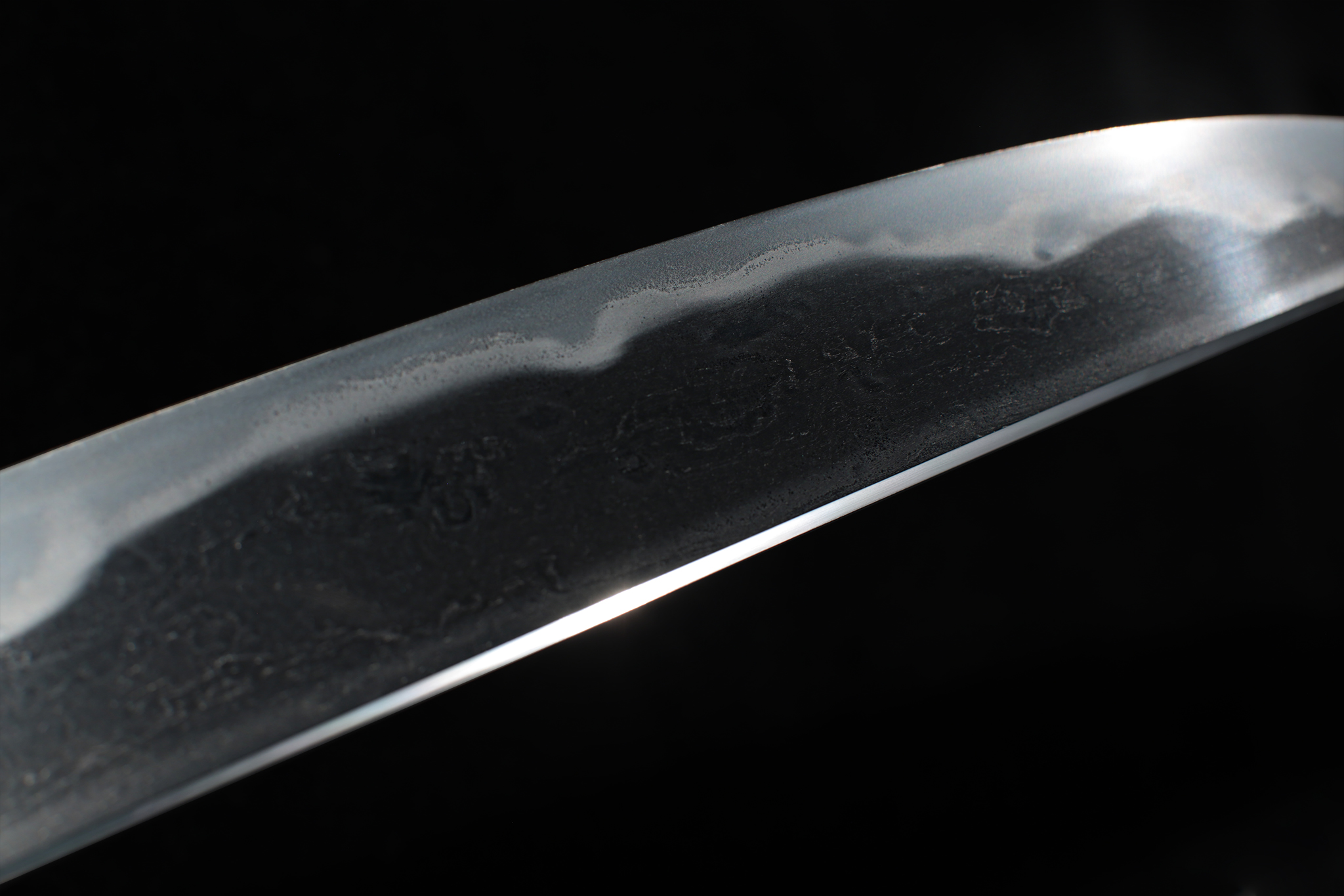 【寸法】刃長 45.2cm(1尺4寸9分1厘)、反り 0.8cm(2分6厘)、元幅 3.35cm、元重ね 0.88cm、目釘孔 2個、刀身重量 536g 、白鞘全長 65.7cm |