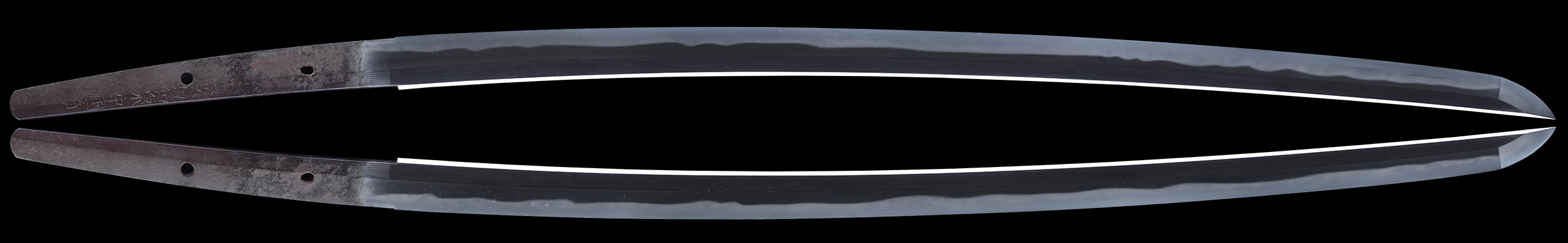 | 【特徴】鎬造、庵棟、身幅広く、重ね厚め、元先にやや幅差つき、反り浅めにつき、中切先延びる姿。 生茎、鑢目筋違、先栗尻、目釘孔二。二寸ほど区を送る。 刃文は、湾れに互の目交じり、匂深く、足入り、沸よくつき、棟焼き入る。 |