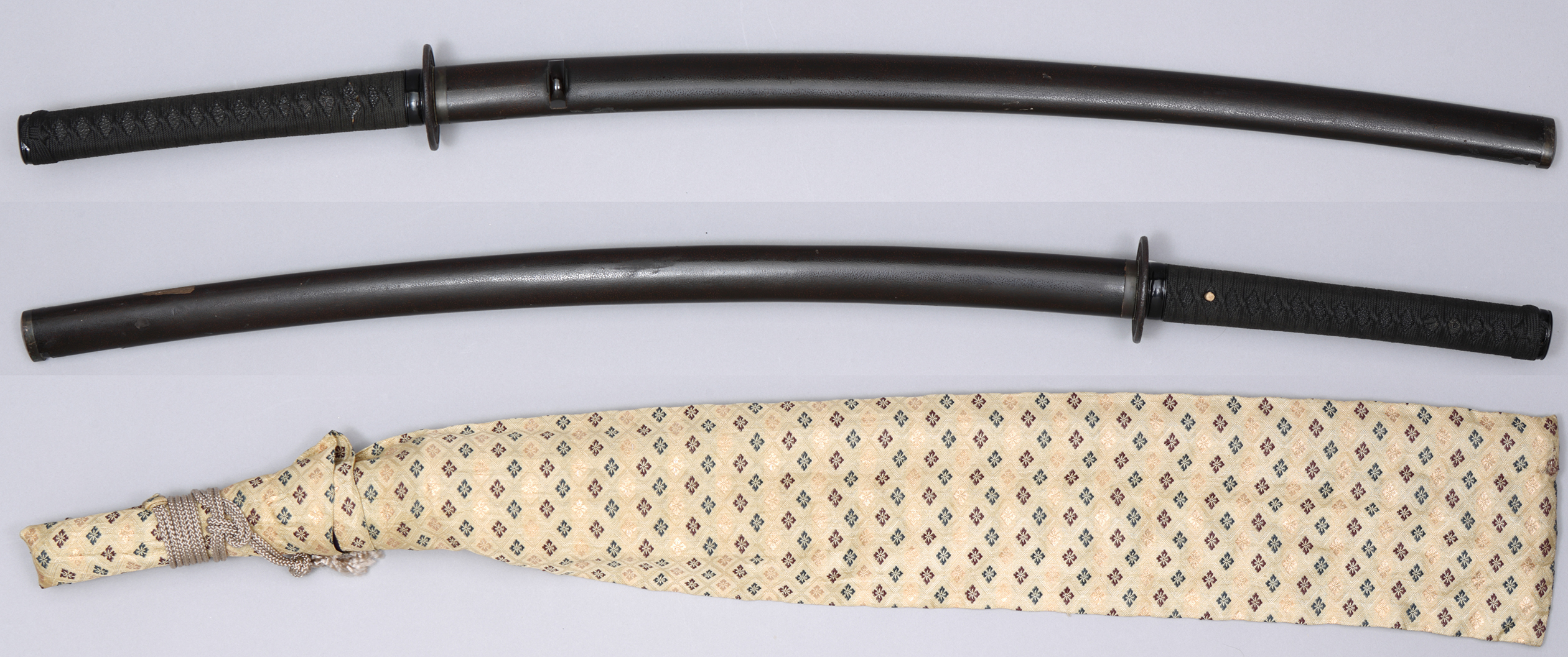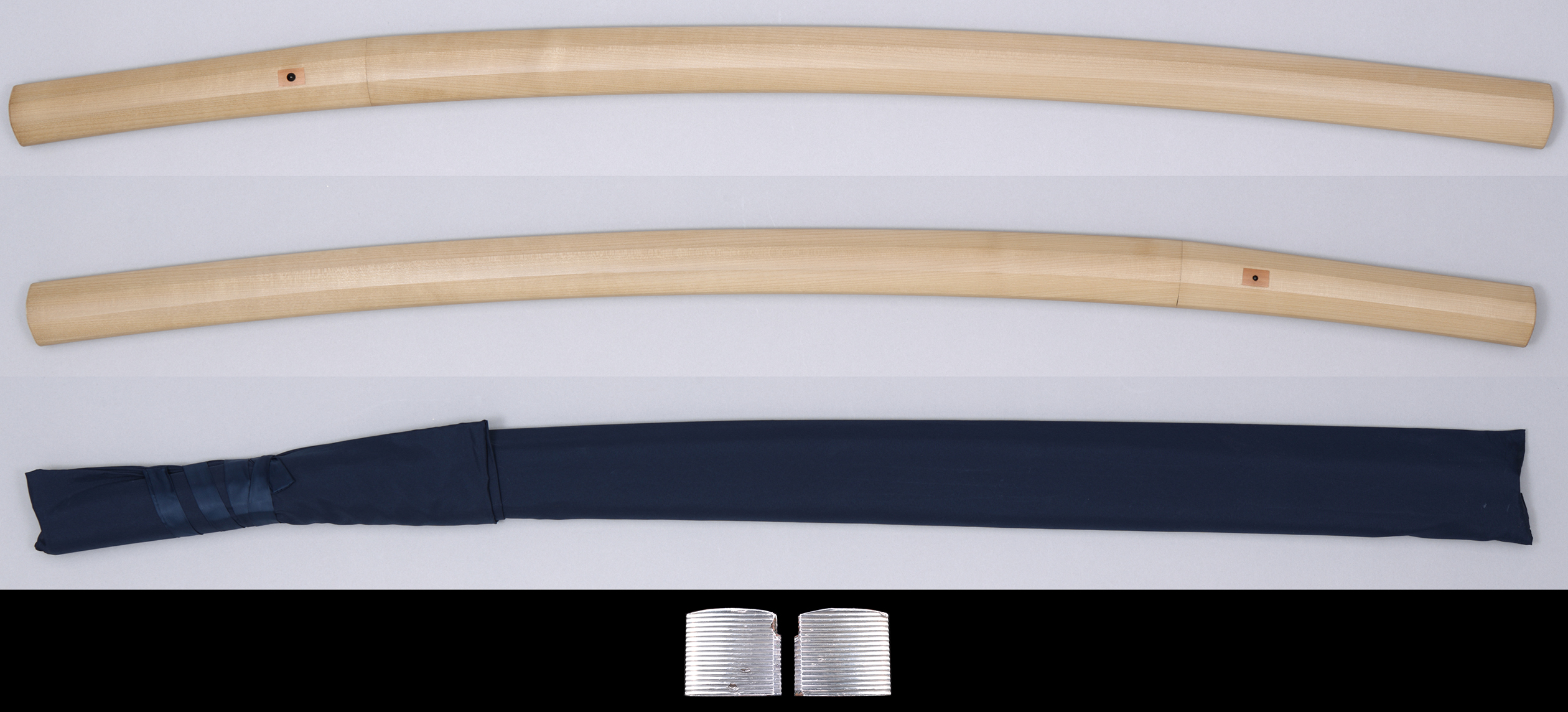 【寸法】刃長 72.4cm(2尺3寸8分9厘)、反り 1.9cm(6分2厘)、元幅 3.41cm、元棟重ね 0.77cm、元鎬重ね 0.85cm、先幅 2.62cm、先重ね 0.59cm、目釘孔 3個中1個埋、刀身重量 1,030g 、白鞘全長 101cm、拵全長 102.5cm