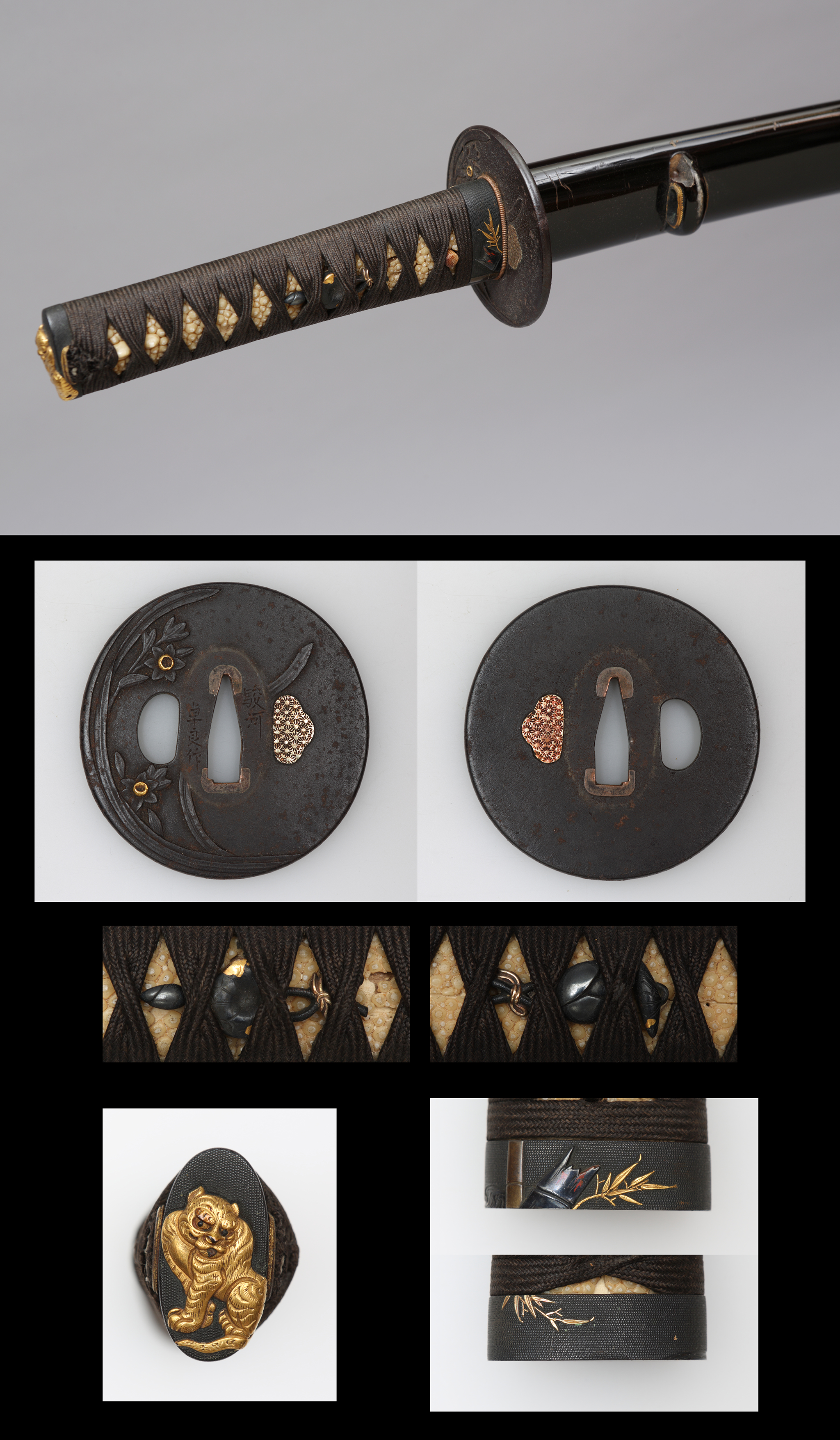 【特徴】鎬造、庵棟、身幅・重ね尋常、元先にやや幅差つき、鎬幅広めに鎬筋高く、反り頃合いにつき、中切先となる姿。 生茎、鑢目切り、先入山形、目釘孔一。 地鉄は、板目肌が総体に柾がかり、杢目を交え、地沸つき、地景入る。 刃文は、細直刃調に小互の目乱れを交え、小沸つき、足入り、ほつれ状の働きがある。 帽子は、直ぐに先掃きかけて返る。 黒呂色塗鞘脇差拵 : 竹割虎図縁頭(赤銅魚々子地高彫金色絵)、水仙図鐔(銘 : 駿河卓良作・鉄地高彫金象嵌)、蓮図目貫(赤銅地容彫金色絵)、茶色糸諸撮巻柄 【見どころ】鎬筋高く元先にやや幅差つき中切先となる姿で、柾がかる地鉄や、小沸つきほつれごころのある刃文で、大和伝を鮮明に顕した作です。保存刀剣鑑定書では貝三原、倉敷刀剣美術館鑑定書では二代南紀重國と極められています。 【状態】良好です。拵は、栗形や鮫皮、塗鞘に経年の使用感がみられ、白鞘とツナギが新調されています。 |