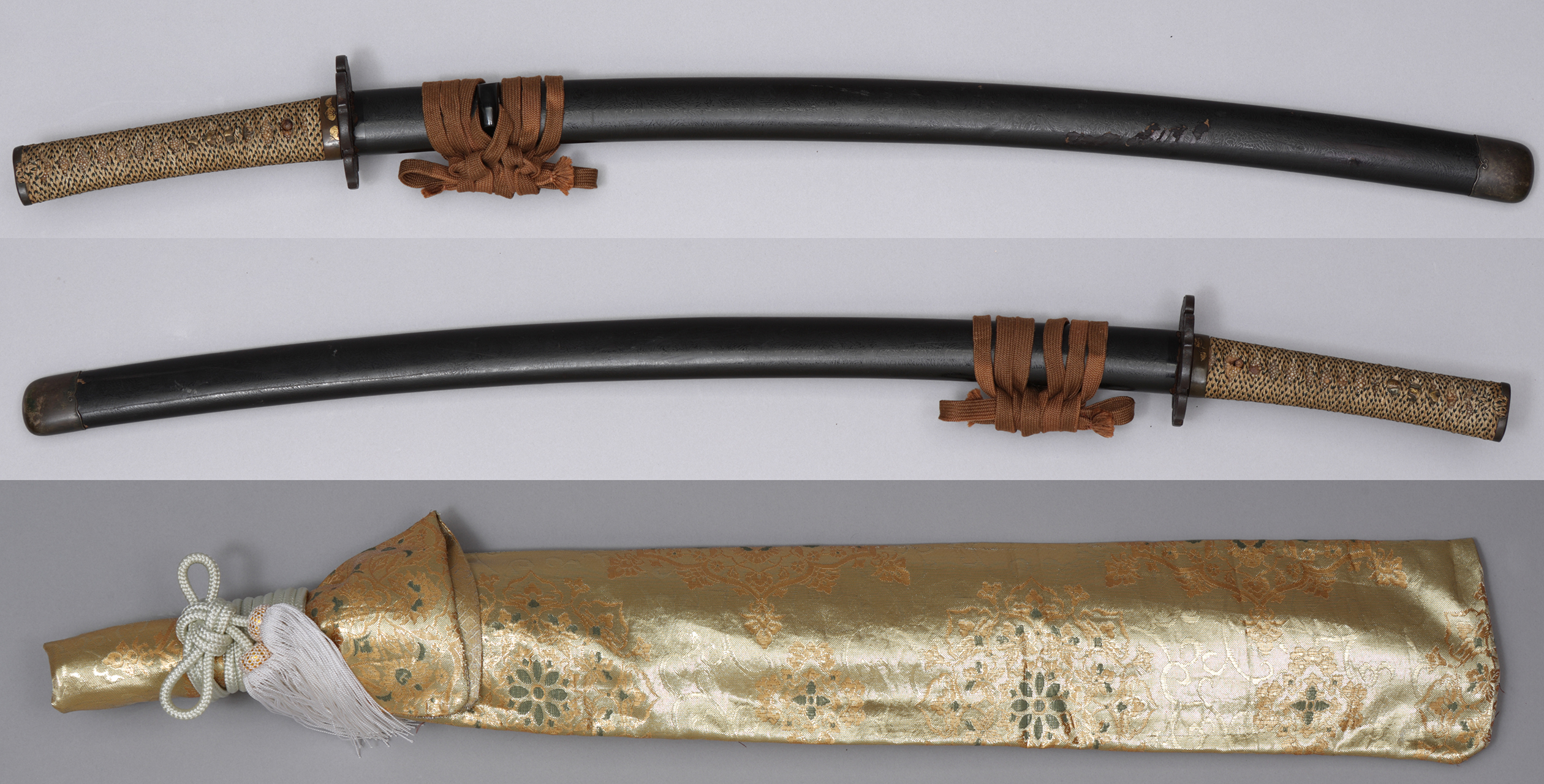 【寸法】刃長 53.6cm(1尺7寸6分8厘)、反り 1.5cm(4分9厘)、元幅 2.91cm、元重ね 0.64cm、先幅 2.05cm、先重ね 0.47cm、目釘孔 1個、刀身重量 518.5g 、拵全長 85cm