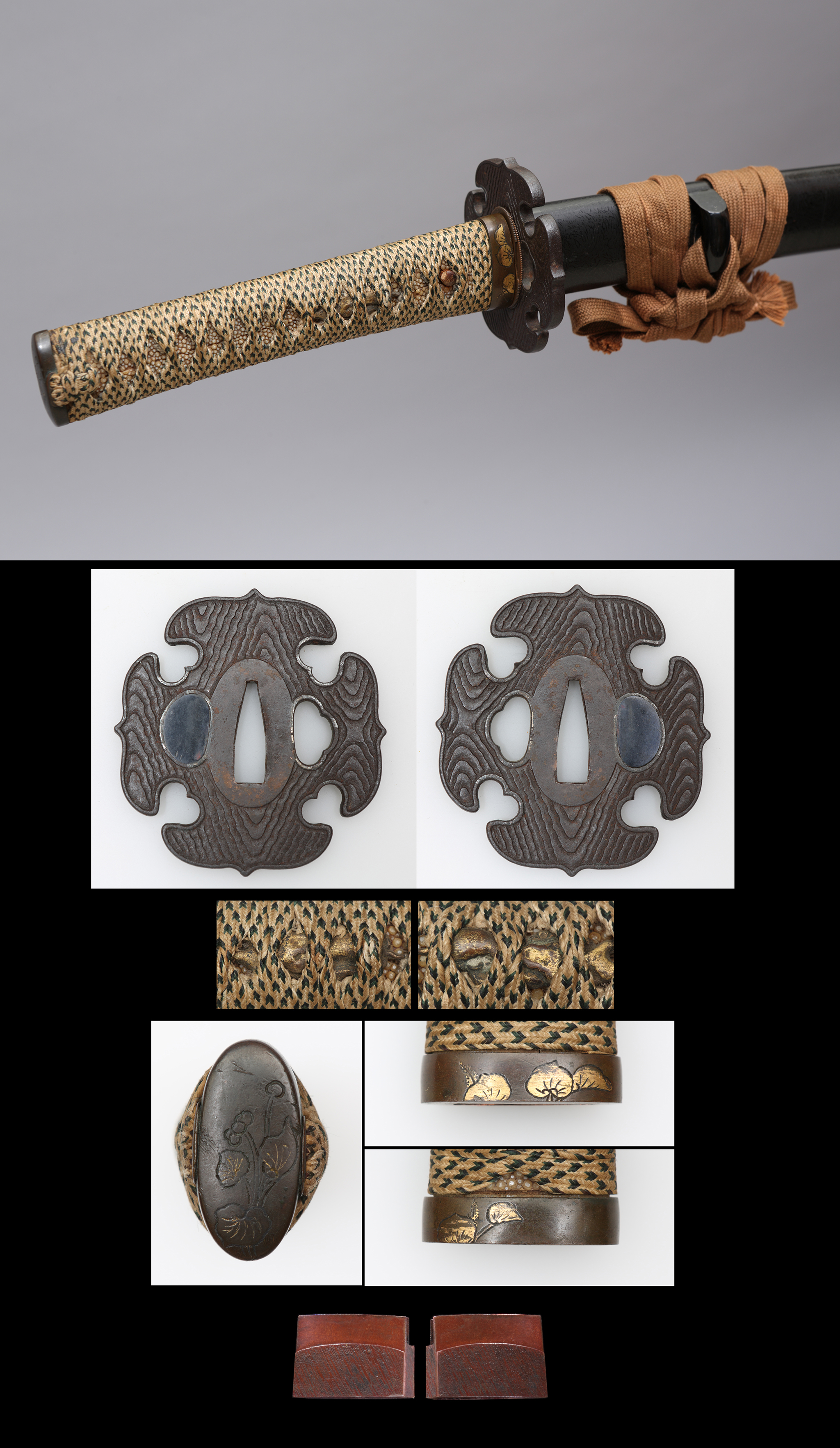 【特徴】鎬造、庵棟、身幅・重ね尋常、反りややつき、中切先となる姿。 生茎、鑢目勝手下がり、先剣形、目釘孔一、差表はばき元に葵文をきる。 地鉄は、板目肌杢交じり、やや肌立ちごころ、地沸つき、地景細かに入り、かな色やや黒めとなる。 刃文は、直刃調、浅く湾れ、互の目刃交じり、匂深く小沸つく。 帽子は、直ぐに小丸、先細かに掃きかける。浅く湾れて三品風がある。 杢目塗鞘脇差拵 : 葵図縁頭(素銅地金象嵌)、植物図目貫(素銅地容彫金色絵)、葵木瓜形杢目文鐔(鉄地)、柄織柄糸諸撮巻柄 【見どころ】越前三代康継は、四郎右衛門といい、越前下坂派の刀工初代康継の三男です。はじめ越前結城家に仕えた初代康継が、慶長十一年頃に徳川家康・秀忠両将軍の前で鍛刀し、その賞として葵紋と「康」の一字を賜って以降、康継家は江戸と越前を一年おきに勤務することとなります。二代康継が没した時、二代の実子右馬助はわずか十七歳でした。そのため四郎右衛門に三代康継を相続させようという一派があり、家督相続の問題が起こります。右馬助が江戸康継家を、叔父四郎右衛門が越前康継家を、両下坂家が別れて相続することで決着し、以後、江戸と越前でそれぞれ定住奉公することとなりました。本作は、初二代の風を継いだ作風で、板目肌杢交じり、やや肌立ちごころとなる越前がねに、直刃調浅く湾れ互の目刃交じる刃文となっています。茎にのびやかに「於越前」銘をきっています。 【状態】刀身は古研ぎの状態で、ごくわずかに小錆やヒケがあるものの概ね良好です。拵は、柄巻きの白鮫着や塗鞘に部分的な剥落があります。 |
