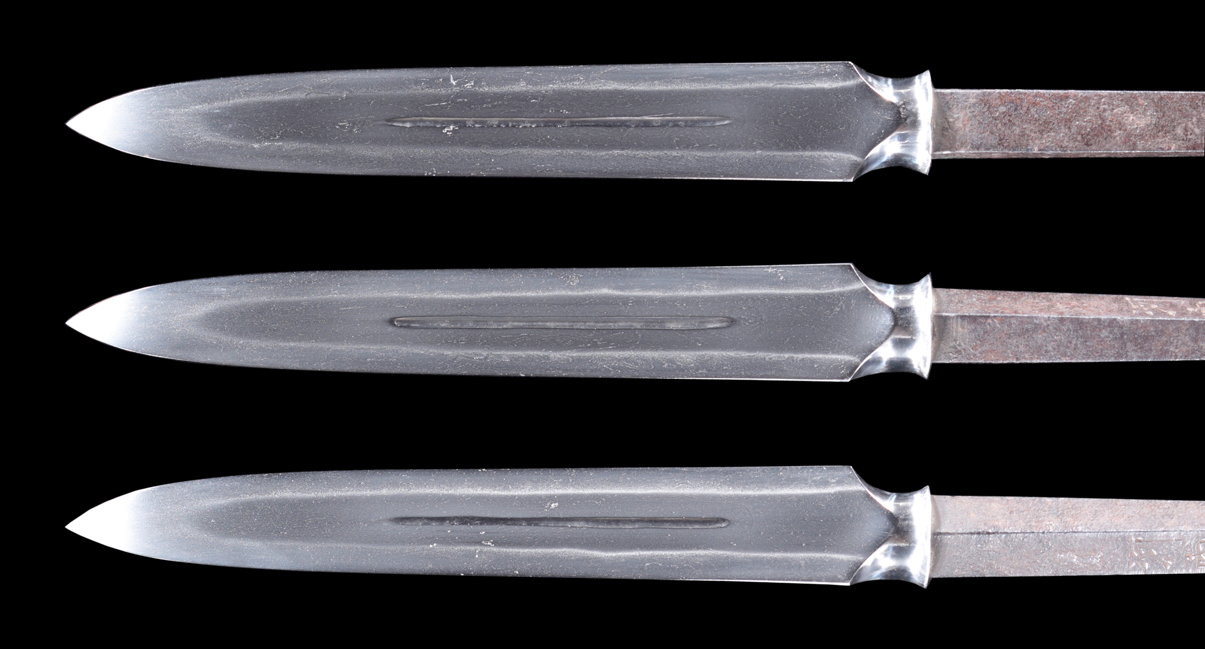 【特徴】姿は、正三角造り、けら首短く、小振りの姿。 生茎、先切り、鑢目切りと筋違、目釘孔一。 彫物は、三面全て平地中央に棒樋を彫り、丸止めとする。 地鉄は、板目肌流れごころとなる。 刃文は、直刃ほつれ、匂口締まり、小沸つく。 帽子は、小丸に返る。 【見どころ】河内守包定は、文殊又三郎といい、延宝頃の大和の刀工で、京・江戸本所でも作刀しました。「和州手掻包永末葉河内守包定」とも銘を切り、年紀には寛文十一、延宝三、貞享三などがあります。 【状態】良好です。 |